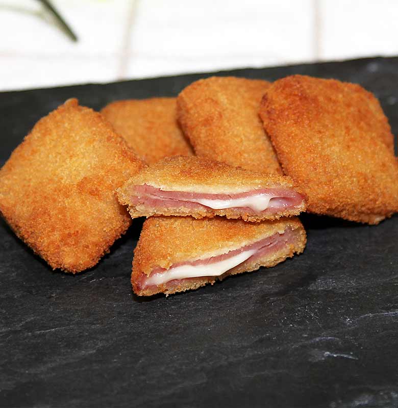Pequeñas porciones de jamón cocido y queso fundente, recubiertas con un empanado crujiente y listas para freír u hornear. Su tamaño mini las convierte en un aperitivo versátil, ideal para tapas, menús infantiles o bandejas de picoteo. Sabor suave, textura cremosa en el interior y un rebozado dorado muy apetecible.